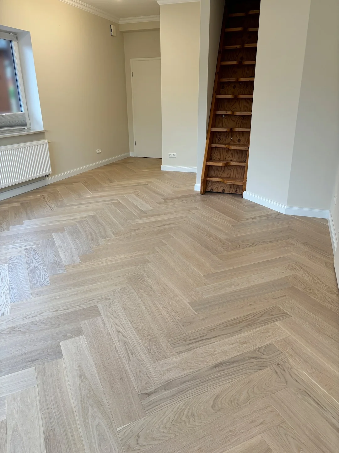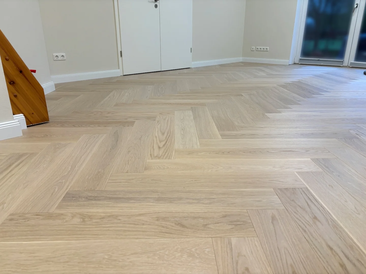 Einzelstabparkett aus Eiche im Fischgrät-Muster verlegt, Oberfläche weißgeölt.